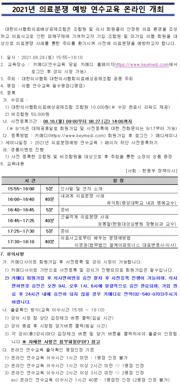 의협 배상공제조합 연수교육 안내(8/28, 필수평점: 2점)