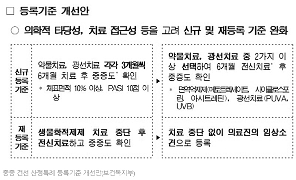 [보험]중증 보통건선 등록기준 개선(약물치료, 광선치료 중 2가지 이상 선택하여 6개월의 전신치료 후 등록)
