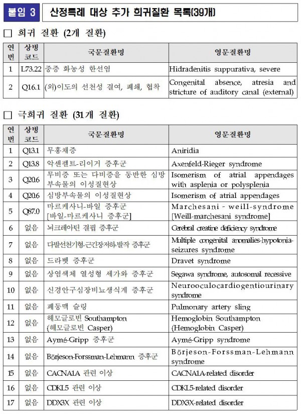 - 신규 지정된 중증화농성한선염, 무홍채증 등 39개* 희귀질환(1,086 → 1,123개, 2개 진단명 통합)은 건강보험 본인부담금 산정 특례(본인부담률 10%로 경감)를 적용할 예정이다.