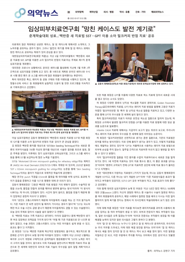 [제17차 대피연 춘계 언론보도]대피연 춘계 심포지엄 성료, SST·GPT 영역 확장 백반증·밀크커피 반점 등 난치성 질환, 어린이도 치료 가능