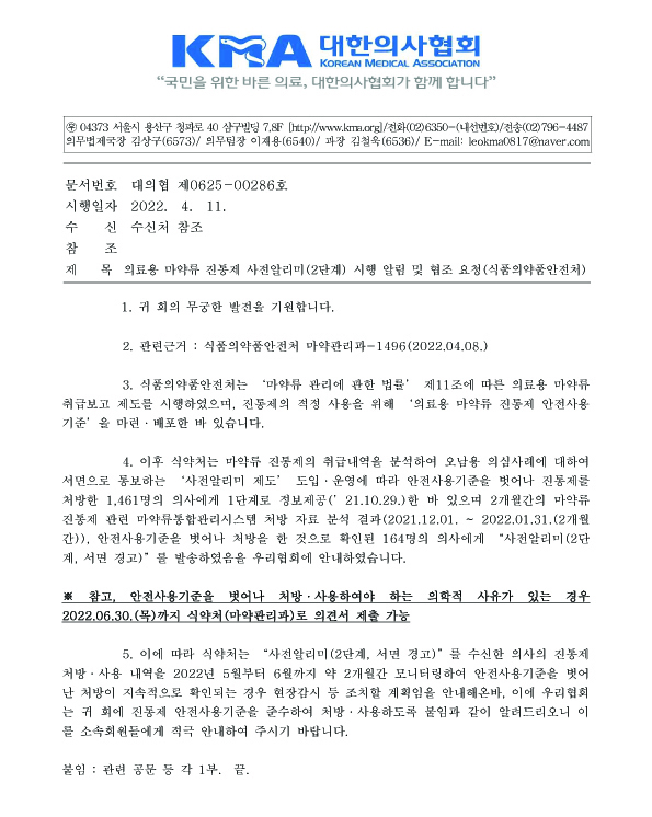 이에 따라 식약처는 “사전알리미(2단계, 서면 경고)”를 수신한 의사의 진통제 처방·사용 내역을 2022년 5월부터 6월까지 약 2개월간 모니터링하여 안전사용기준을 벗어난 처방이 지속적으로 확인되는 경우 현장감시 등 조치할 계획이라고 하니, 서면 경고를 수령하신 회원님들께서는 유의 하여 주시기 바랍니다.