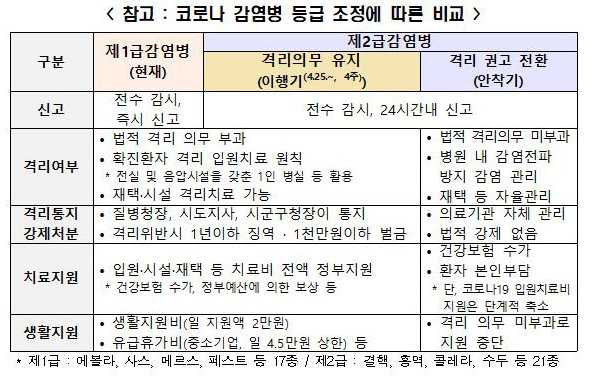 - 코로나 감염병 등급을 4월 25일 1급에서-->’격리(7일)의무가 있는 2급‘으로 조정, 약 4주간의 이행기 이후 ’격리권고‘로 전환(격리 의무 해제)