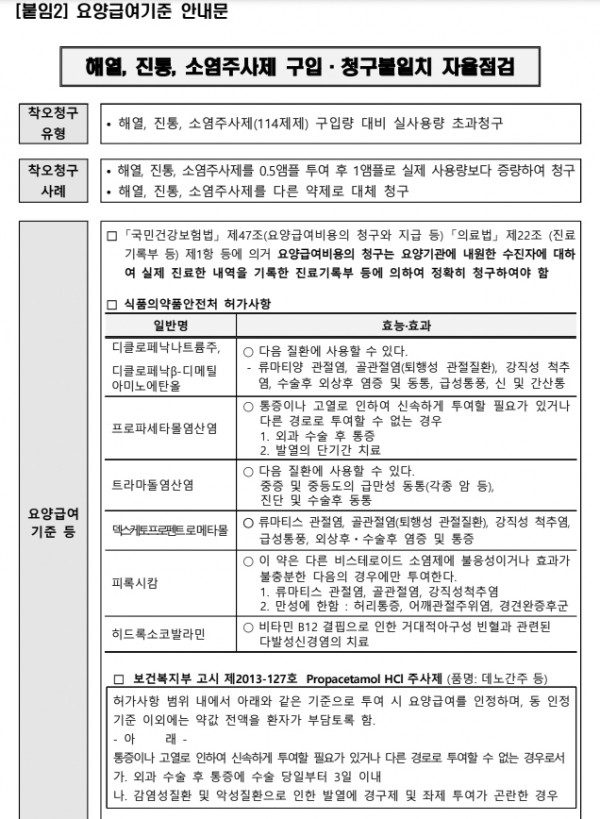 2. 현지조사 사전예방 기능강화를 위한 “요양·의료 급여비용 자율점검제” 도입에 따라 요양기관 착오 개연성이 높은「해열, 진통, 소염 주사제 구입·청구 불일치」와 관련하여 자율점검제를 시행하고자 해당 요양기관에 관련 사항을 통보하였음을 알려드립니다.