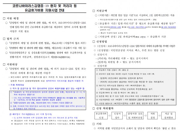 [노동부]코로나19 근로자 입원·격리 시 유급휴가(국가로부터 비용 지원), 무급휴가(가족돌봄휴가, 1일 5만원 최대 10일까지)