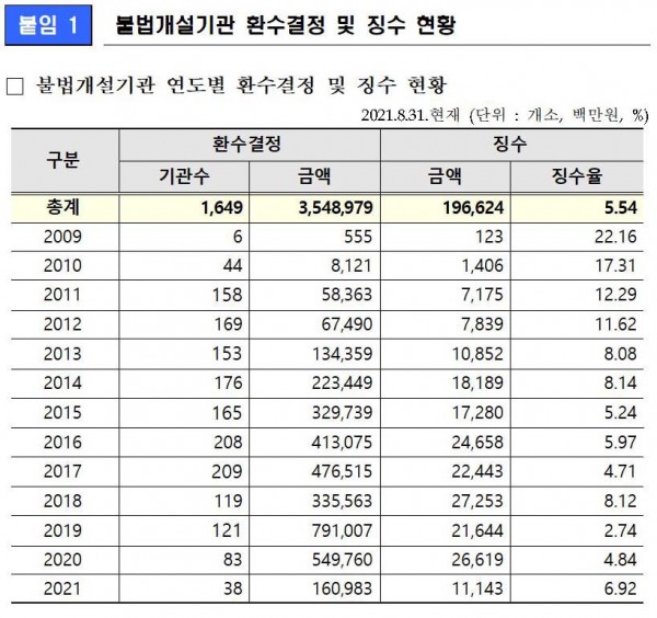 - 불법개설 기관으로 인한 요양급여비용이 3조5천억원(`21.8월 기준)에 이르고 있으나, 사무장의 재산 은닉 등으로 징수율은 5.5%에 그치고 있어, 건강보험료의 증가요인으로 되고 있다