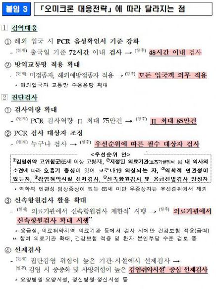 현재는 원하는 사람은 누구나 PCR 검사를 받을 수 있지만 확진자 및 검사 수요 급증 시에는 감염 취약 고위험군 등 검사가 반드시 필요한 사람만 검사를 받는 체계로 전환하는 계획도 발표했다. 한정적인 검사 역량을 효율적으로 활용하겠다는 목적에서다.