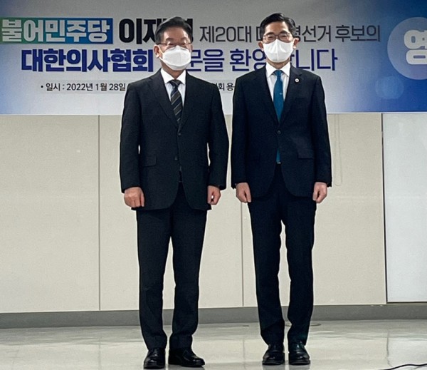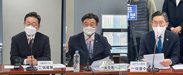 더불어민주당 이재명 대선후보와 코로나19위기대응특별위원회 관계자들이 28일 오후 의협 용산임시회관을 찾아 대한의사협회(회장 이필수)와 함께 코로나19 위기상황 및 오미크론 변이 확산 사태와 관련해 논의했다.