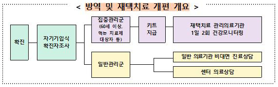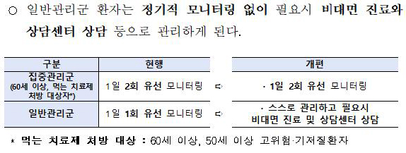 - 일반 관리군은 비대면 진료 중심 관리, 시도별 재택관리지원 상담센터 운영