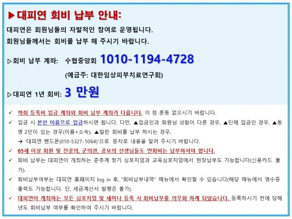 ▷회비 납부 계좌: 수협중앙회 1010-1194-4728 (예금주: 대한임상피부치료연구회)