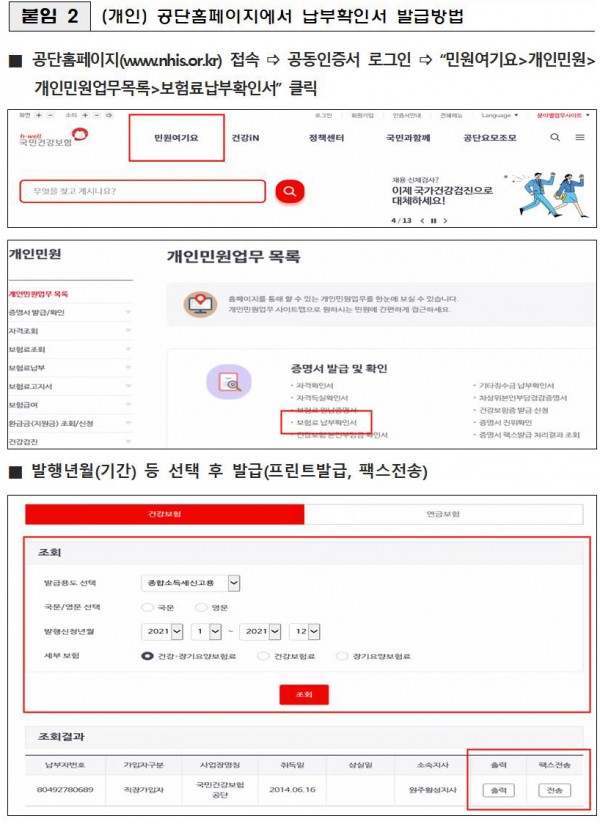 [건보공단]2021년 귀속 종합소득세 신고용 4대 사회보험료 납부내역, ‘국세청 홈택스’에서 확인