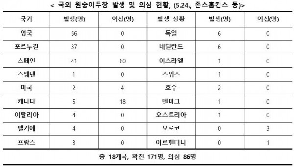 □ ‘22년 5월 이후 유럽, 미국, 이스라엘, 호주 등 원숭이 두창이 풍토병이 아닌 18개국에서 원숭이 두창 감염 및 의심사례가 다수 보고되었고 사망자는 발생하지 않았다(5.24. 기준).