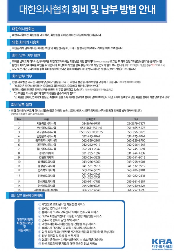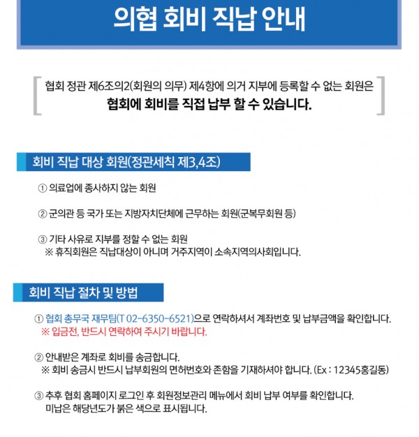 [대한의사협회]의협 회비 및 납부방법(직납은 특별한 경우를 제외하면 불가, 회비 기준액)