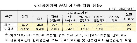 - 이번 개산급(26차)은 472개 의료기관에 총 6,758억 원을 지급하며, 이 중 6,730억 원은 감염병전담병원 등 치료의료기관(440개소)에, 28억 원은 선별진료소 운영병원(32개소)에 각각 지급한다.