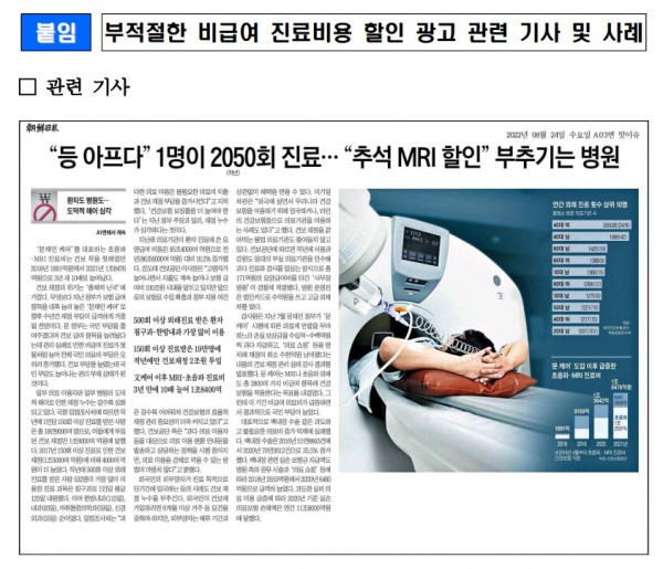 부적절한 비급여 진료비용 할인 광고 행태를 자제하도록 안내 하오니 참고 하시기 바랍니다.