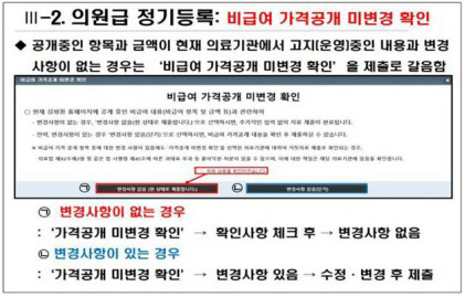 만약 변동이 없을 경우 심평원 업무 포털시스템의 '비급여 진료비용 송수신시스템'에 접속한 뒤 '비급여 가격공개 미변경 확인'에서 '확인사항' 체크 후 '변경사항 없음(현 상태로 제출합니다)'을 체크하면 올해 제출 의무를 이행한 것으로 인정받을 수 있다.