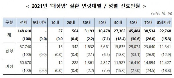 1. 2021년 ‘대장암‘ 질환, 60대가 30.6%(45,484명) 차지
