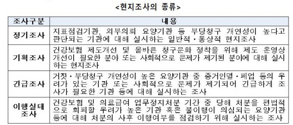 - 현지조사는 진료비 청구 자료 분석을 통해 ‘진료비 이중청구 의심 요양기관’을 대상으로 2022년 하반기에 실시할 예정이다.