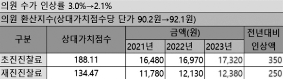 2023년도 의원 유형 수가 인상률이 2.1%로 확정됐다. 이에 따라 내년도 의원 초진료는 1만 7320원, 재진료는 1만 2380원을 적용한다.