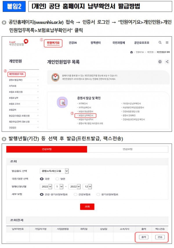 종합소득세 신고용 4대보험 납부확인서는 사업장의 경우 사회보험통합징수포털(si4n.nhis.or.kr), 개인은 공단 홈페이지(www.nhis.or.kr)에서 확인 및 발급이 가능하며 시·군·구 민원실, 지하철역 등 전국 곳곳에 설치된 무인민원발급기를 통한 발급도 가능하다.