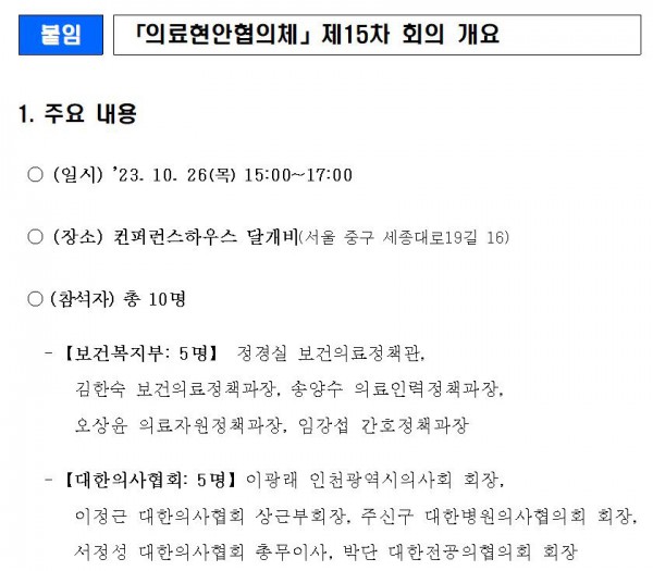 보건복지부(장관: 조규홍)와 대한의사협회(회장: 이필수)는 10월 26일(목) 15시에 컨퍼런스하우스 달개비(서울 중구 소재)에서「의료현안협의체」 제15차 회의를 개최하였다.