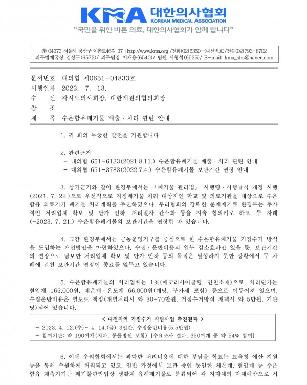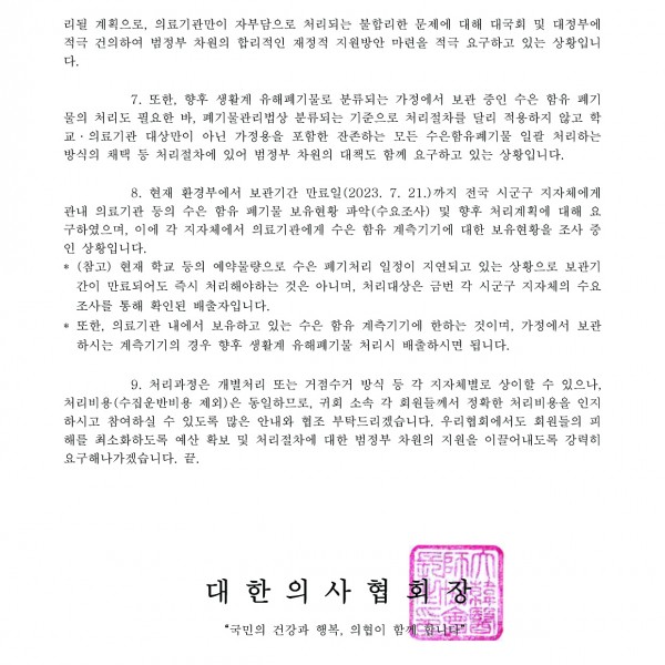 대한의사협회는 처리과정과 관련해 개별처리 또는 거점수거 방식 등 각 지자체별로 상이할 수 있으나, 처리비용(수집운반비용 제외)은 동일하므로 귀 회 소속 각 회원들이 정확한 처리비용을 인지하고 참여할 수 있도록 많은 안내와 협조를 요청하며, 회원들의 피해를 최소화하도록 예산 확보 및 처리절차에 대한 범정부 차원의 지원을 이끌어내도록 강력히 요구해 나가겠다는 입장을 전달하였습니다.