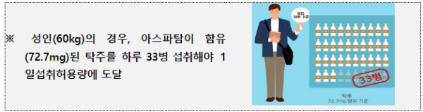 성인(60kg)의 경우, 1)아스파탐이 함유된 제로 콜라 250mL(아스파탐 43mg 함유 시)는 하루 55캔, 2)아스파탐이 함유된 750mL 탁주(아스파탐 72.7mg 함유 시)는 하루 33병을 섭취해야 1일섭취허용량에 도달하게 됩니다.