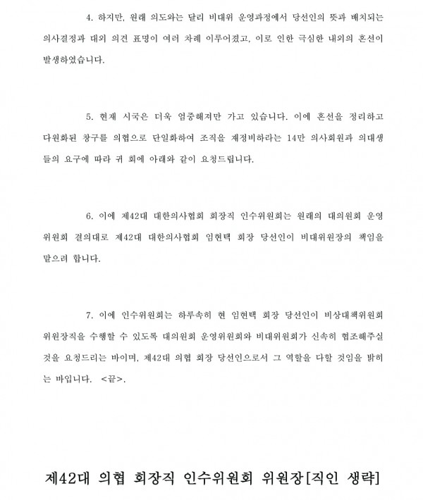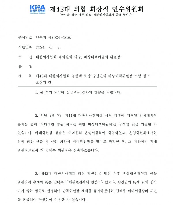 인수위원회는 현재 시국이 더욱 엄중해져만 가고 있으므로 혼선을 정리하고 다원화된 창구를 의협으로 단일화하여 조직을 재정비하는 것이 14만 의사회원과 의대생들을 위해 가장 합리적인 방안이라 생각한다고 전하며, 제42대 대한의사협회 임현택 회장 당선인이 비대위원장의 책임을 맡아, 14만 의사들과 의대생들의 뜻을 담아내는 것이 좋다는 결론에 이르렀다고 밝혔다.