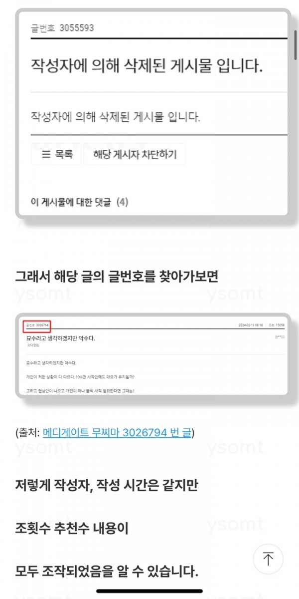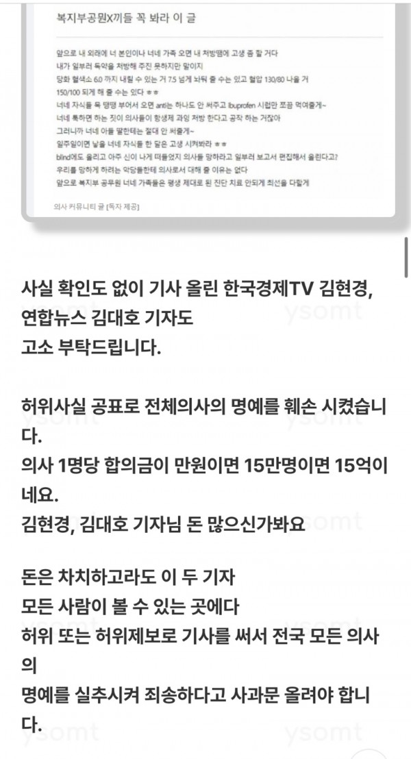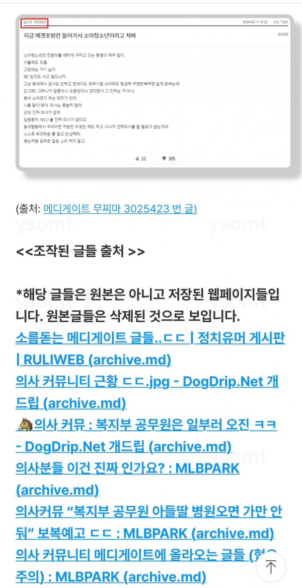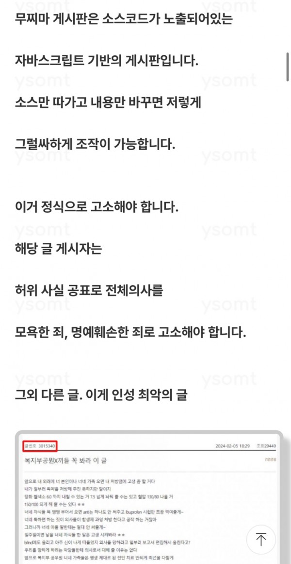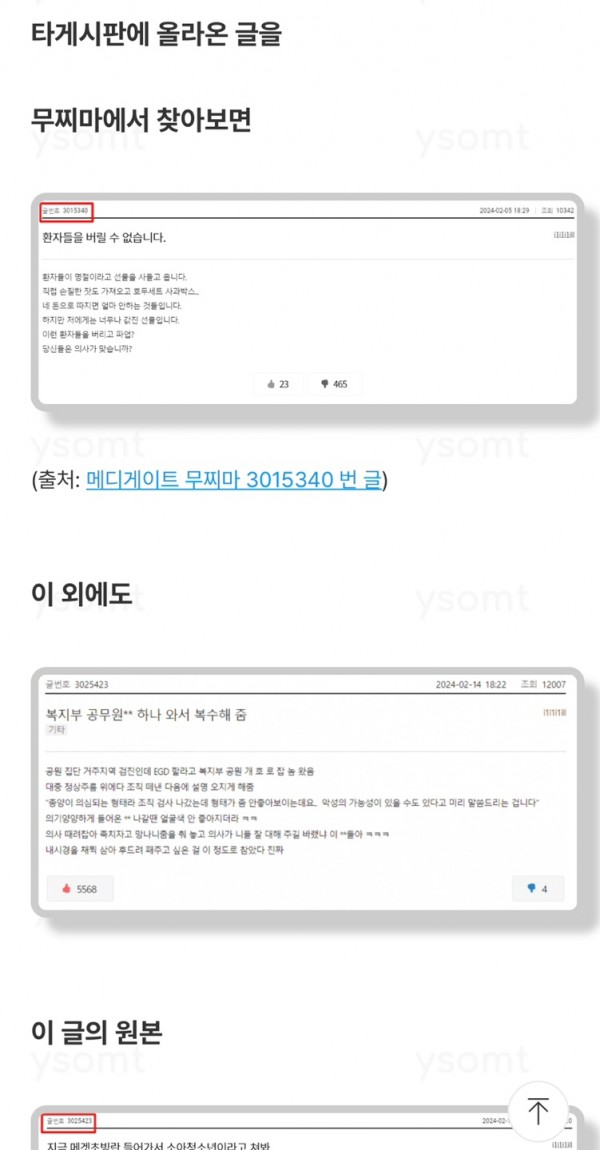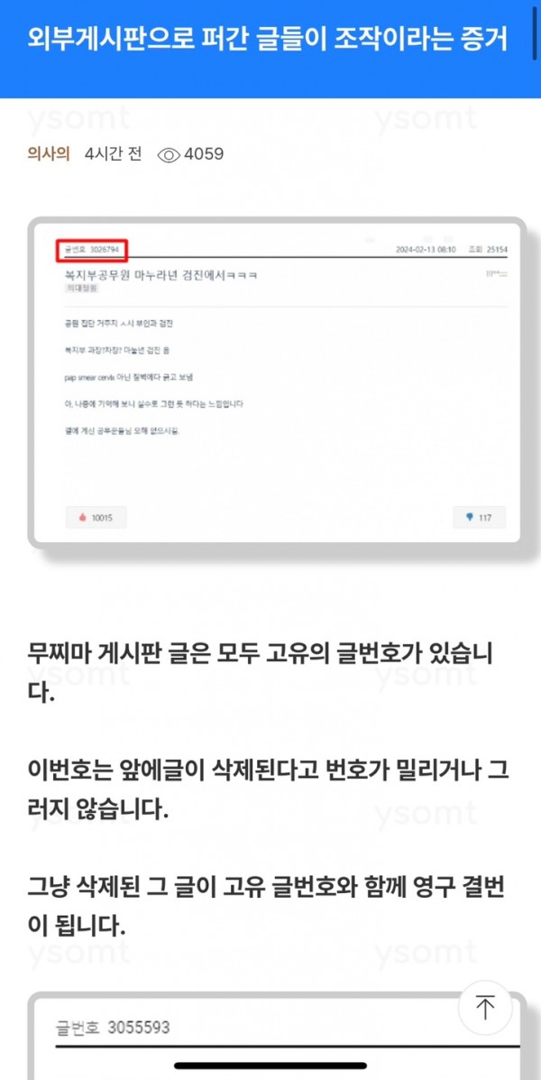 각종 SNS와 의사 커뮤니티에 의사를 사칭하여 악의적으로 올린 글들 사례 대피연 메일보내기 이름으로 검색 0 10,170 2024.02.25 20:51 짧은주소 - 짧은주소: https://www.laserpro.or.kr:443/bbs/?t=do3 주소복사 × 짧은 글주소 복사 Note! 위 주소를 드래그, 복사(Ctrl+C)하여 사용하세요. 이전글다음글 목록 본문 각종 SNS와 의사 커뮤니티에 의사를 사칭하여 악의적으로 올린 글들 사례 대한의사협회 비대위 업무지원팀 입니다.최근, 각종 SNS와 의사 커뮤니티에서 본인이 의사라고 자칭하며 환자, 공무원 등 국민들을 상대로 악의적인 행동을 한 것을 마치 영웅담인듯 말하고 있는 게시글들이 올라오고 있습니다.저희 측에서 확인해본 결과 이들은 명백히 조작된 글이며, 사실이 아님을 말씀 드립니다.이에, 관련 파일을 보내드리오니, 확인 부탁드립니다. 이전글다음글 목록 댓글목록 등록된 댓글이 없습니다.