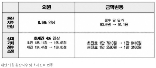 의료계의 반발에도 정부가 동일 유형 내 환산지수 차등 적용 이른바 '환산지수 쪼개기'를 고수하면서, 이날 회의에서 ▲의원급 내년 수가는 환산지수 0.5% 및 초·재진료 4% 인상 ▲병원급은 환산지수 1.2% 인상 및 휴일 등 가산 확대로 그 적용 방안이 정해졌다.
