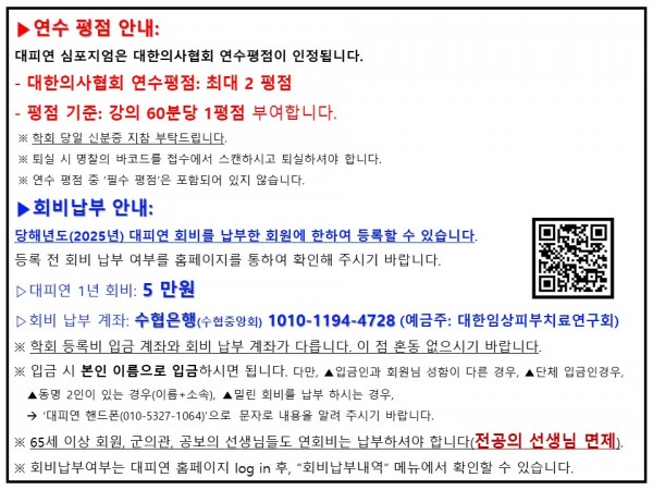 - 회비 납부 계좌: 수협은행(수협중앙회) 1010-1194-4728 (예금주: 대한임상피부치료연구회)