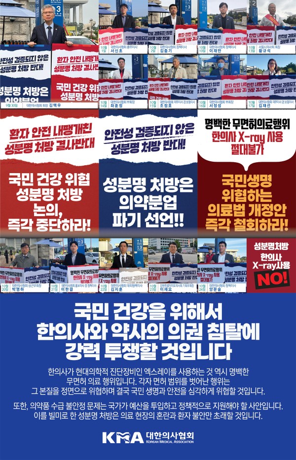 한편, 의협은 지난 9월 말부터 국회 앞 릴레이 1인시위를 지속해나가고 있으며, 약사·한의사 등의 의권침탈 행위를 막아 국민건강을 지키기 위해 강경대응 해나갈 방침이다.
