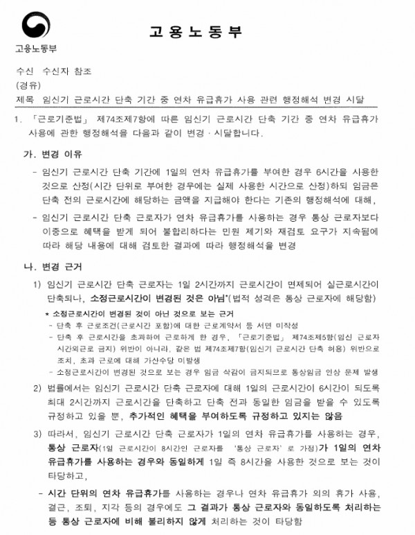 [노동부]임산부.임신기 근로시간 단축(2시간) 중 연차 휴가시 '6시간'이 아니라 '8시간' 사용한 것으로 처리