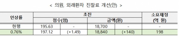의원급의 경우 상대가치 연계 투입 재정을 고려, 초진 진찰료를 0.76% 인상키로 했다.