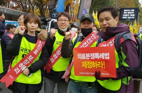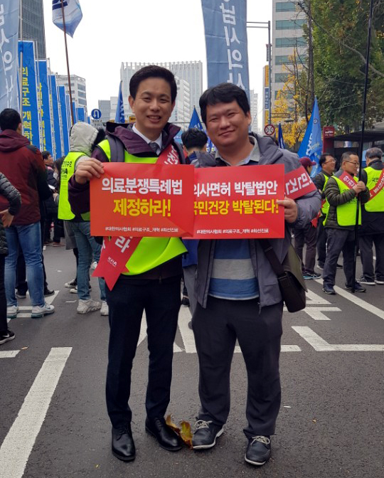 "생사가 오가는 전쟁터 같은 진료 현장에서 국민의 생명을 지켜야 할 의사들이 피 끓는 심정으로 길거리에 나섰다"