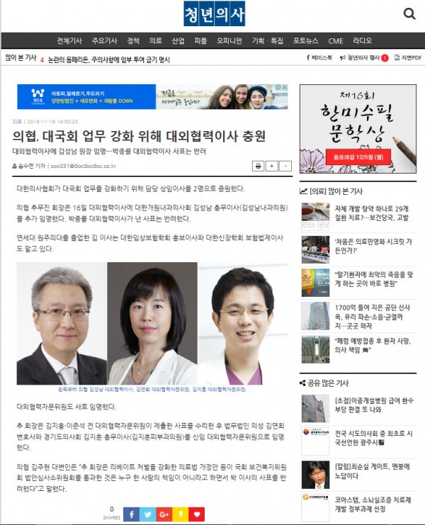 본 회 김지훈 총무이사가 지난 11월 16일 제39대 대한의사협회(회장: 추무진) '대외협력 자문위원'으로 위촉 되었습니다.
