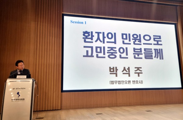 본 회 박석주 법제이사(법무법인 오른 대표 변호사)가 지난 11월 4일 아주대학교병원 대강당에서 개최된 ‘제9회 수원시의사회 학술대회’에서 ‘환자의 민원으로 고민 중인 분들께’라는 주제로 강연을 하였습니다.