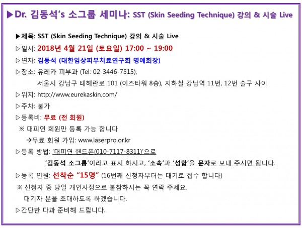 ▶Dr. 김동석‘s 소그룹 세미나: SST (Skin Seeding Technique) 강의 & 시술 Live