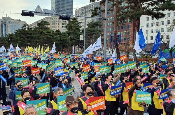 이날 전국에서 모인 보건복지의료연대 소속 회원들은 갑자기 내려간 영하의 날씨에도 간호법 제정 저지를 한목소리로 외쳤다.