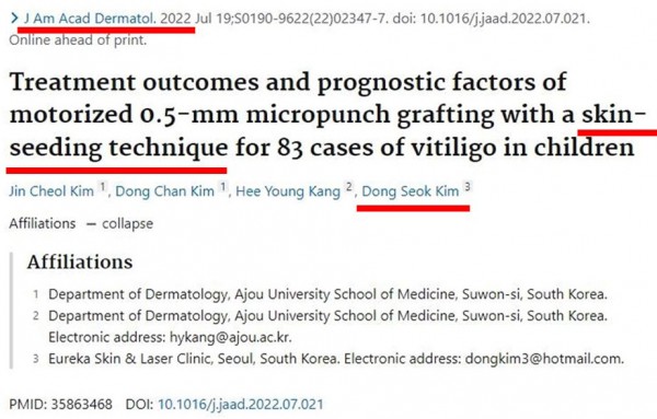 ▷김동석 명예회장 백반증 치료 논문 ‘SST (Skin Seeding Technique)’ 제목으로 JAAD에 게재: