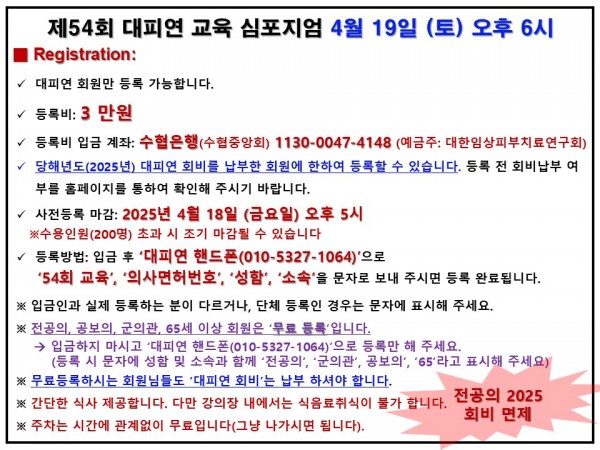 - 회비 납부 계좌: 수협은행(수협중앙회) 1010-1194-4728 (예금주: 대한임상피부치료연구회)