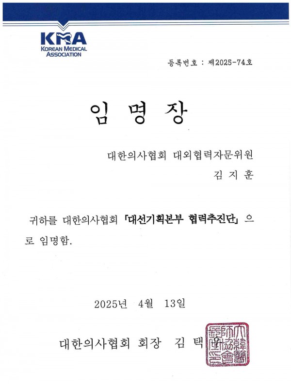 ▶김지훈 회장, 제43대 의협 대외협력자문위원 위촉