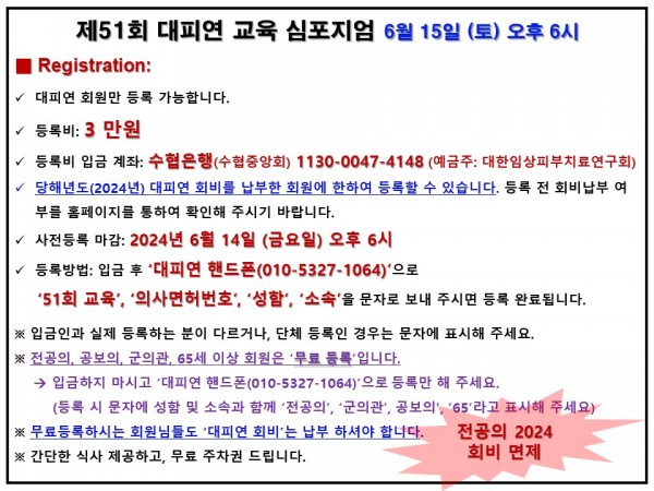 ‘51회 교육’, ‘의사면허번호’, ‘성함’, ‘소속’을 문자로 보내 주시면 등록 완료됩니다.