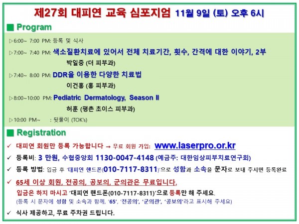 ▷등록비: 3 만원, 수협중앙회 1130-0047-4148 (예금주: 대한임상피부치료연구회)