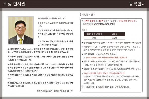 그동안 5차례의 ‘on-line seminar’를 개최해 본 경험을 토대로 회원님들께서 불편함이 없이 심포지엄을 집에서 시청하실 수 있도록 최선을 다해 준비하도록 하겠습니다.