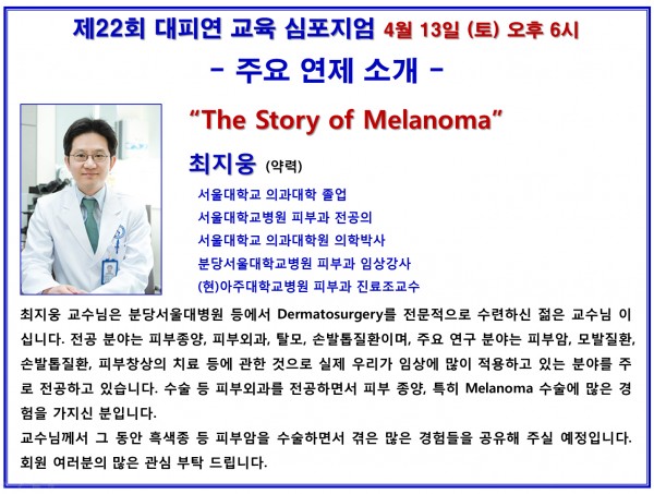교수님께서 그 동안 흑색종 등 피부암을 수술하면서 겪은 많은 경험들을 공유해 주실 예정입니다. 회원 여러분의 많은 관심 부탁 드립니다.