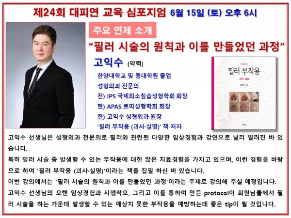 이번 제24회 교육심포지엄에서는 성형외과 전문의인 고익수 선생님을 모시고 ‘필러 시술의 원칙과 이를 만들었던 과정‘이라는 주제로 강의를 들어 보도록 하겠습니다. 고익수 선생님의 다양한 경험과 시행착오, 그리고 이를 치료하던 경험이 회원여러분들의 실력을 한 단계 upgrade 시키는데 도움이 될 것입니다.