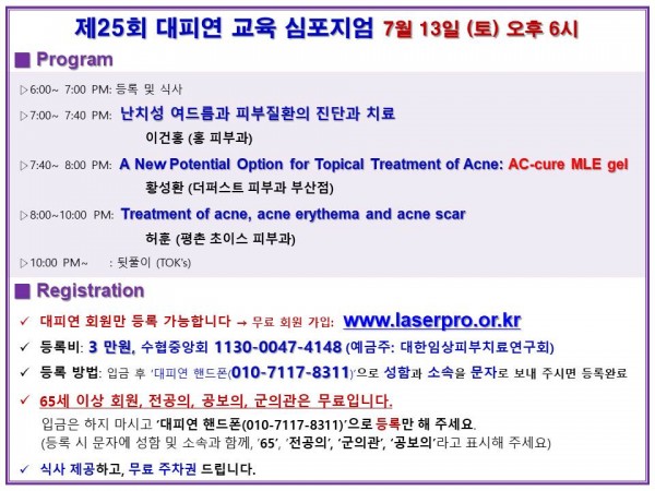 ▷등록비: 3 만원, 수협중앙회 1130-0047-4148 (예금주: 대한임상피부치료연구회)