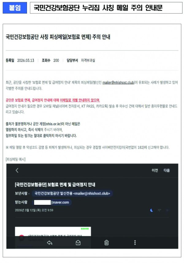 #붙임: 국민건강보험공단 누리집 사칭 메일 주의 안내문