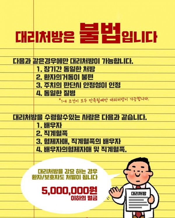 대리처방과 관련되어 의료법이 강화되어 적용되고 있습니다.