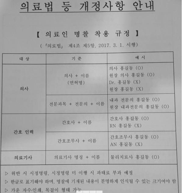 안내문에 따르면 의사 명찰의 경우 ‘의사 홍길동’ 또는 ‘원장 의사 홍길동’ 등으로 표시해야 하며 ‘원장 홍길동’, ‘Dr. 홍길동’ 등으로 표현해선 안 된다.